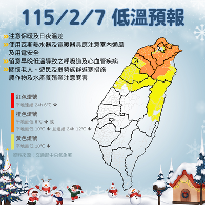 依據 #交通部中央氣象署 資訊,明(7)日寒流南下中部以北、東北部及東部天氣明顯轉冷,其他地區早晚亦冷,8日至9日清晨寒流影響,各地天氣非常寒冷,明日下午起至8日局部地區有持續10度左右或以下氣溫(橙色燈號)發生的機率,請注意防範。