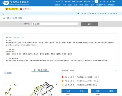 交通部中央氣象署為使各界能掌握更細緻之陸地強風預警資訊,於本(114)年3月起試辦「陸上強風特報鄉鎮燈號」作業,期間運作順利,並自同年12月起正式上線
