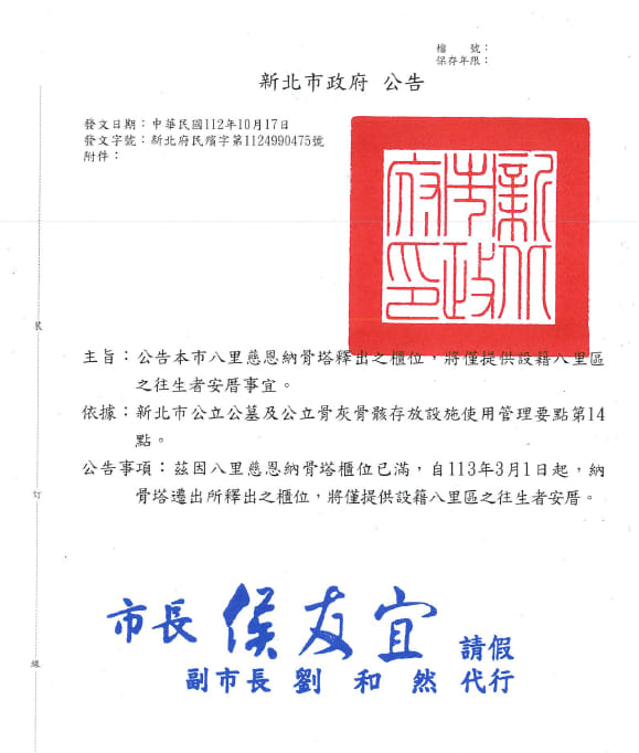 - 依據新北市政府112年10月17日新北府民殯字第1124990475號公告事項辦理:「茲因八里慈恩納骨塔櫃位已滿,自113年3月1 日起,納骨塔遷出所釋出之櫃位,將僅提供設籍八里區之往生者安厝。」